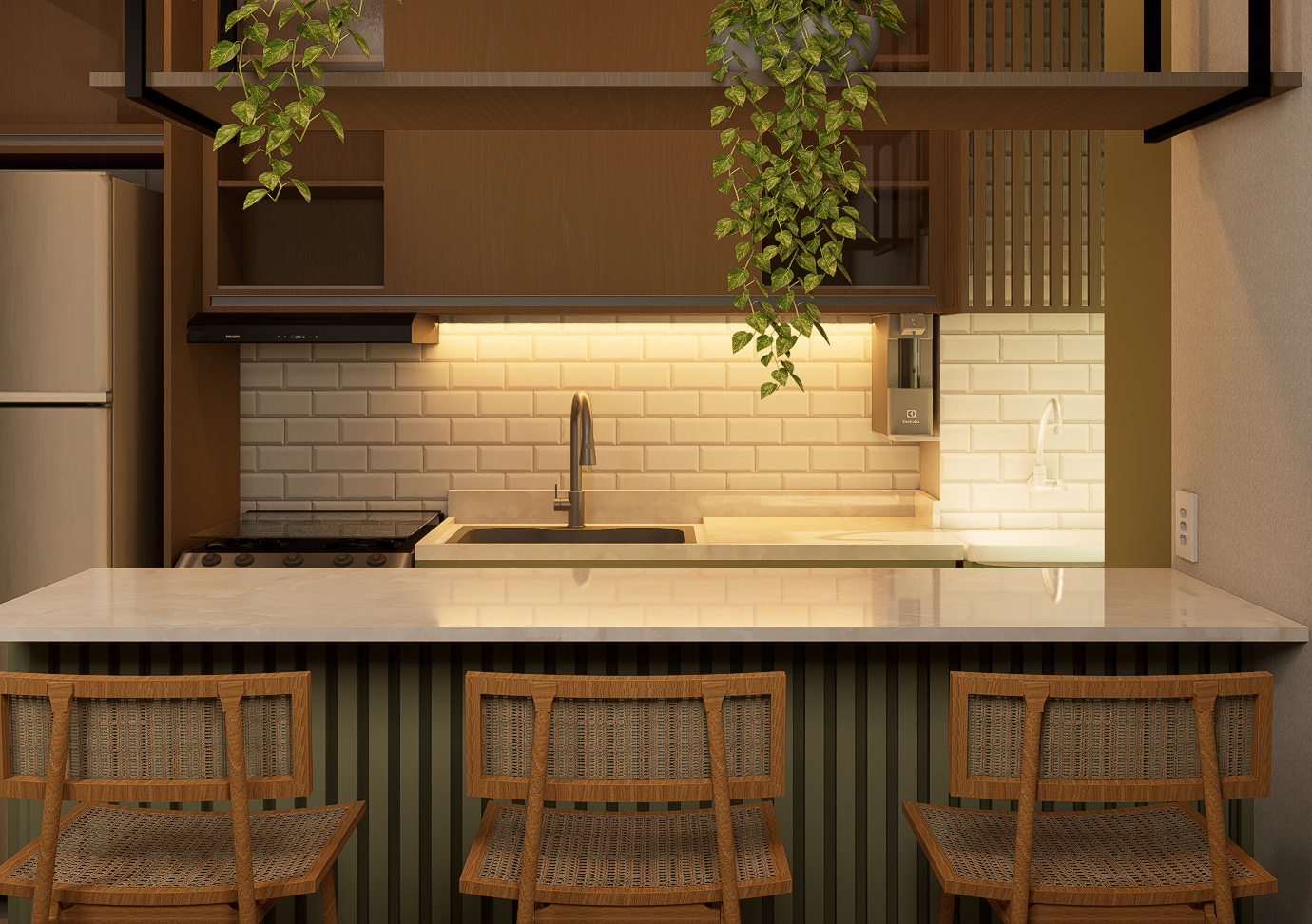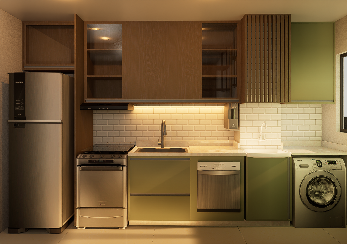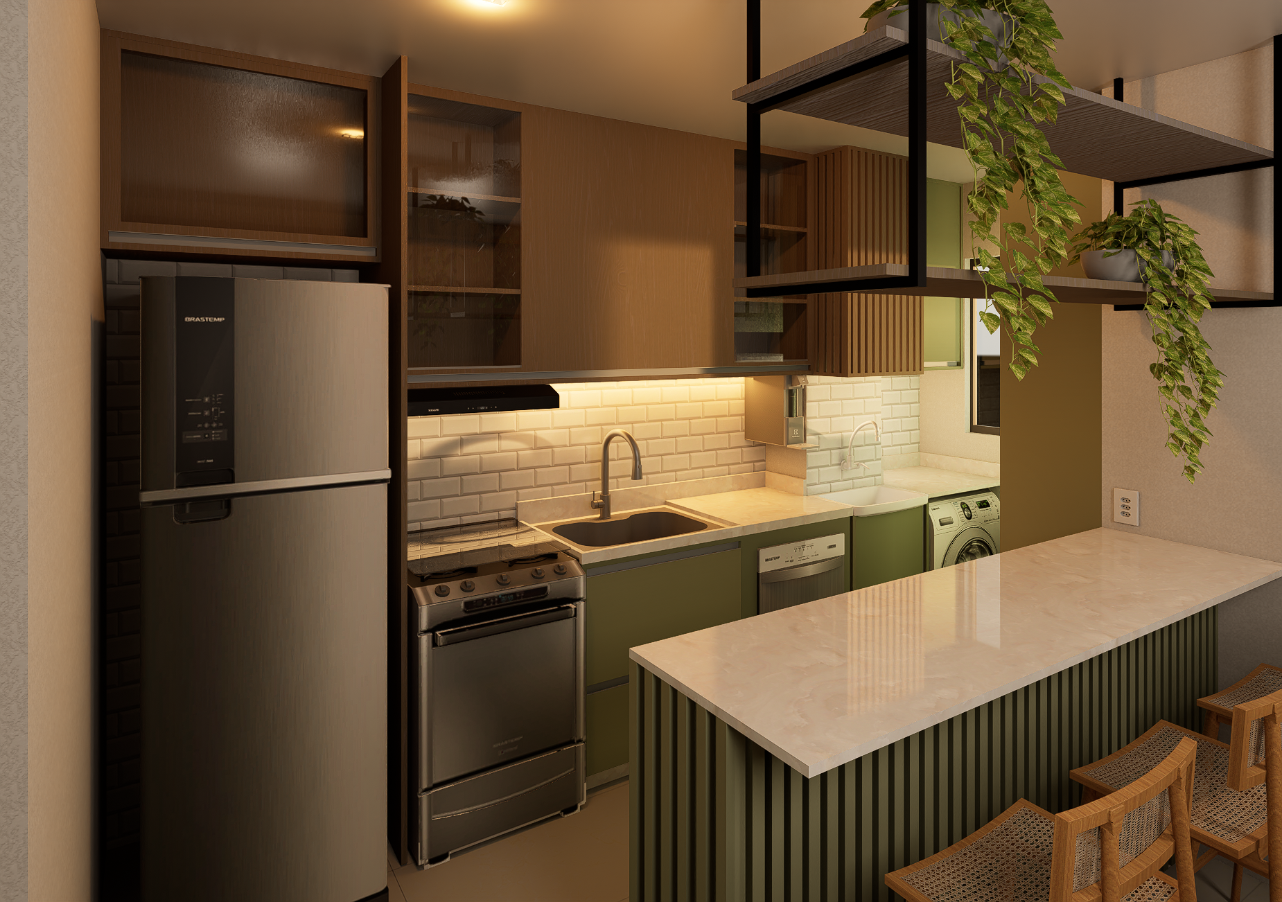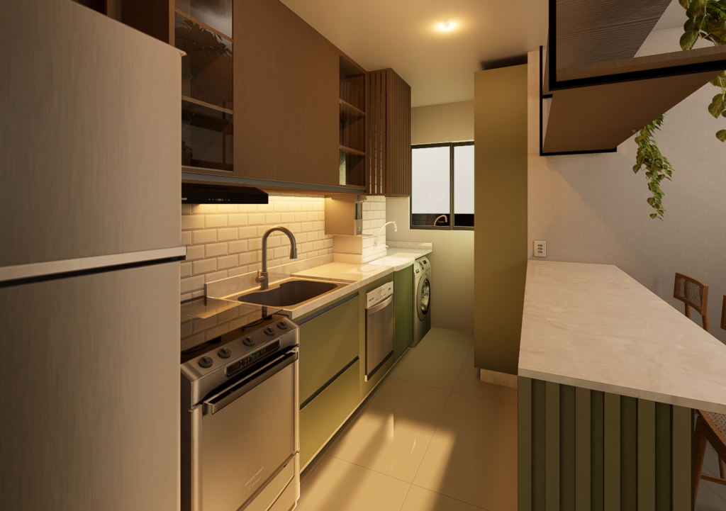 Este projeto une funcionalidade e estética em um ambiente integrado, onde cozinha e área de serviço se conectam de forma fluida e harmoniosa, aproveitando cada centímetro do espaço. A paleta contemporânea combina o verde oliva da marcenaria com o tom quente da madeira natural e, junto à iluminação estratégica, cria um espaço acolhedor e cheio de personalidade.